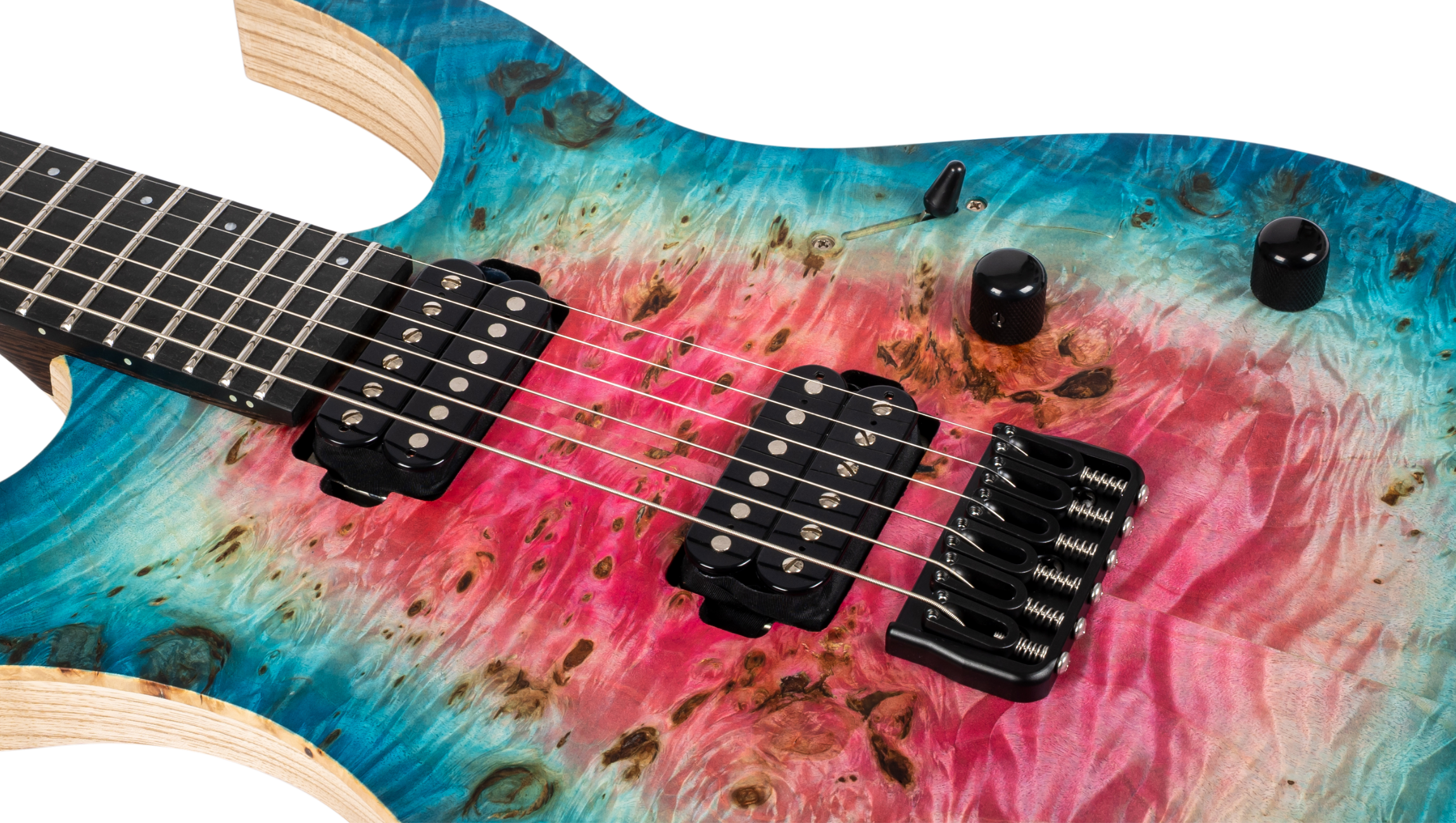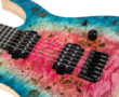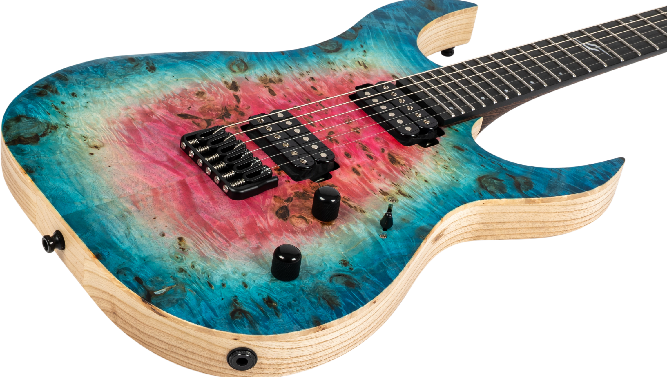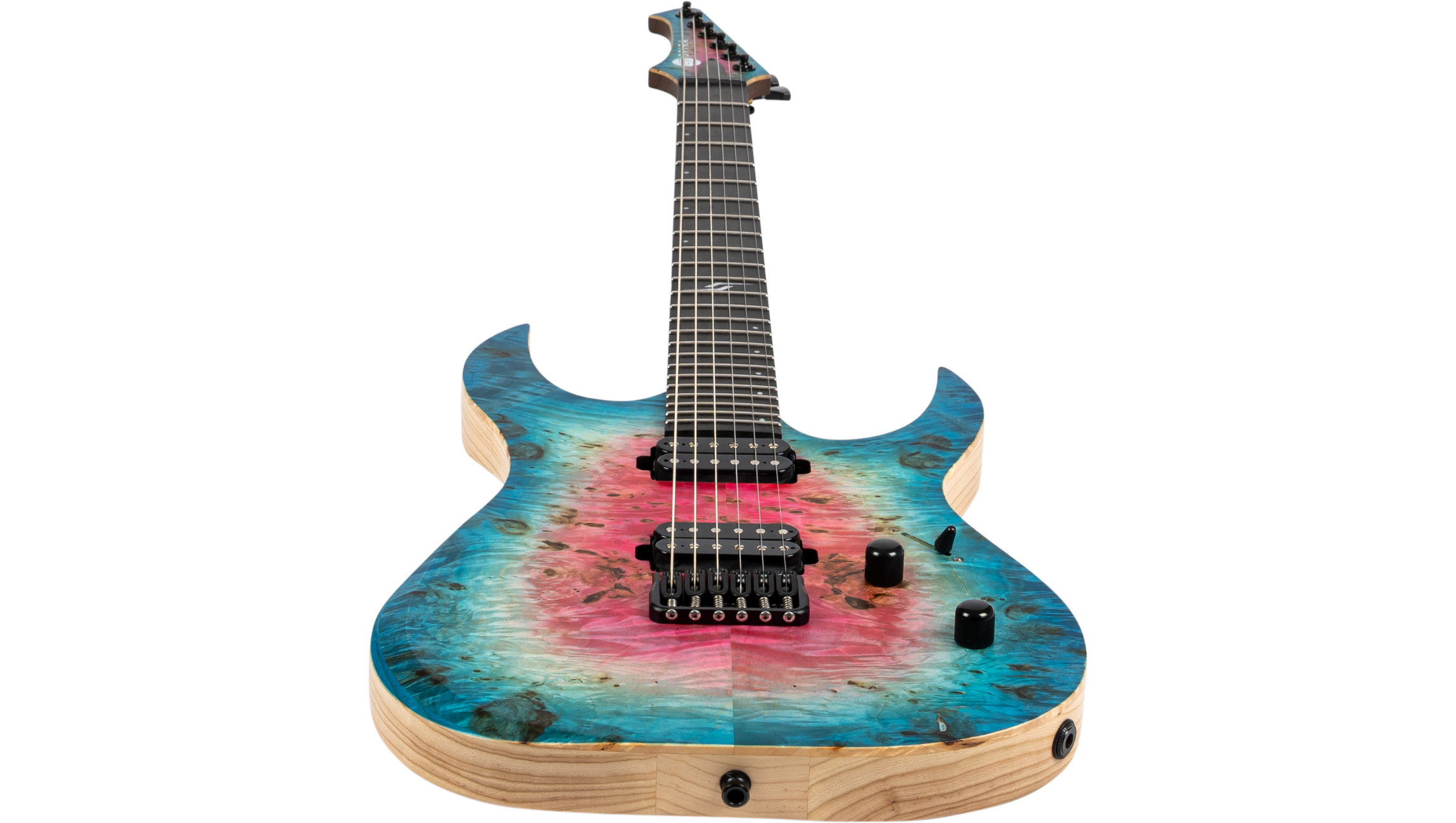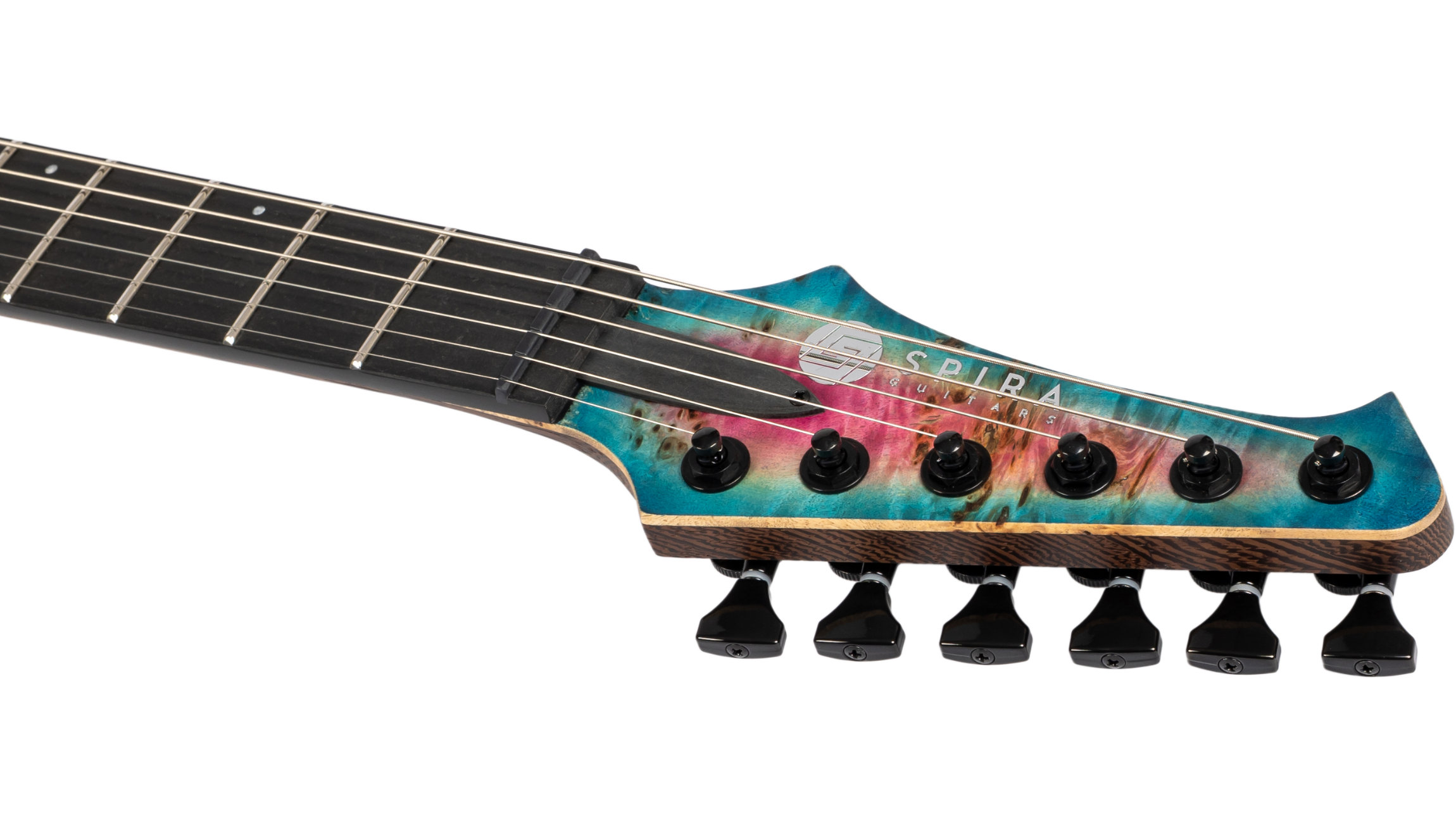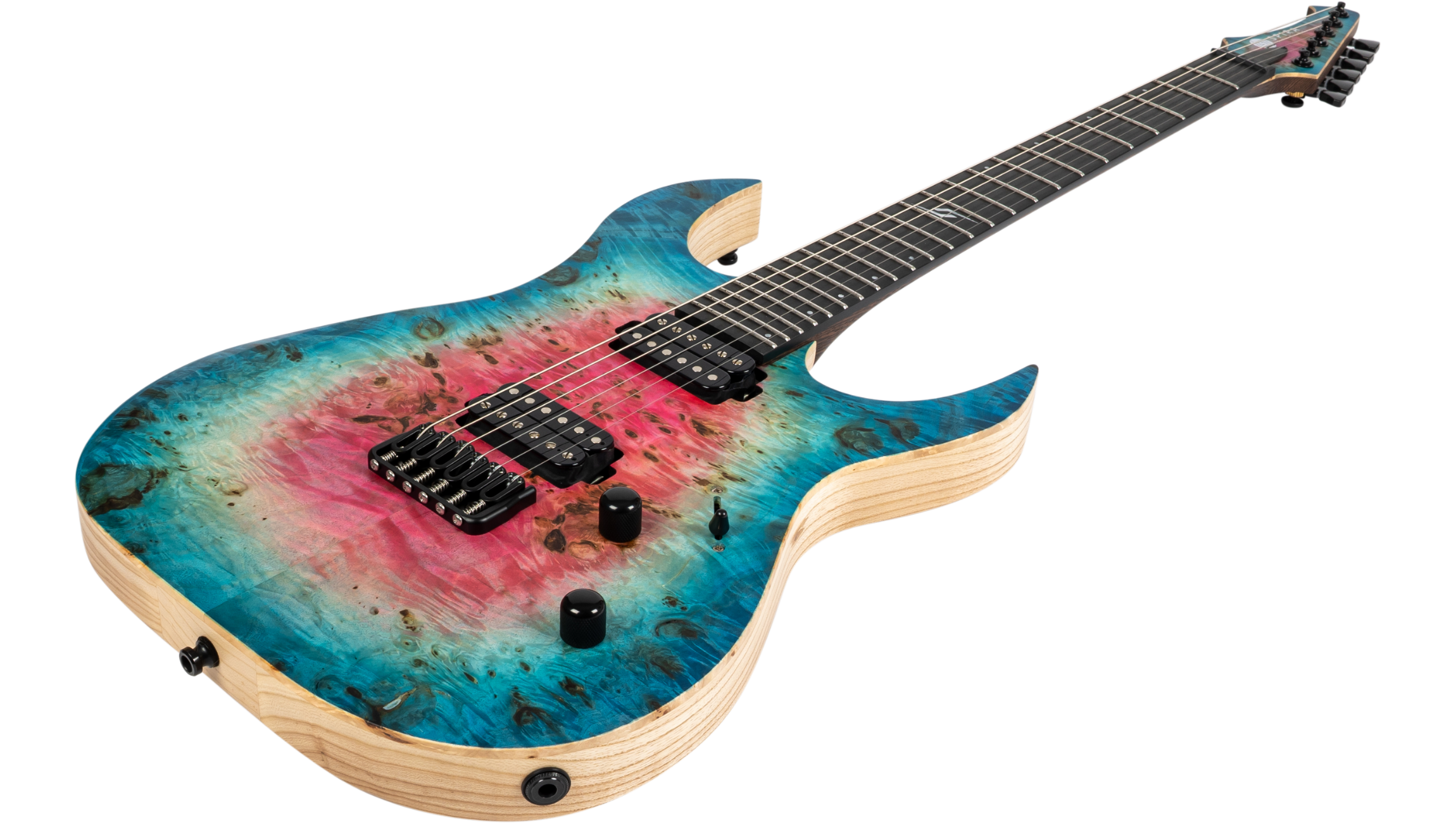 The Spira Custom Shop 6 String in Satin Watermelon Burst is built to demand attention. A premium poplar burl top with intense figuring and deep knots creates a striking visual that feels alive, bold, and impossible to ignore.